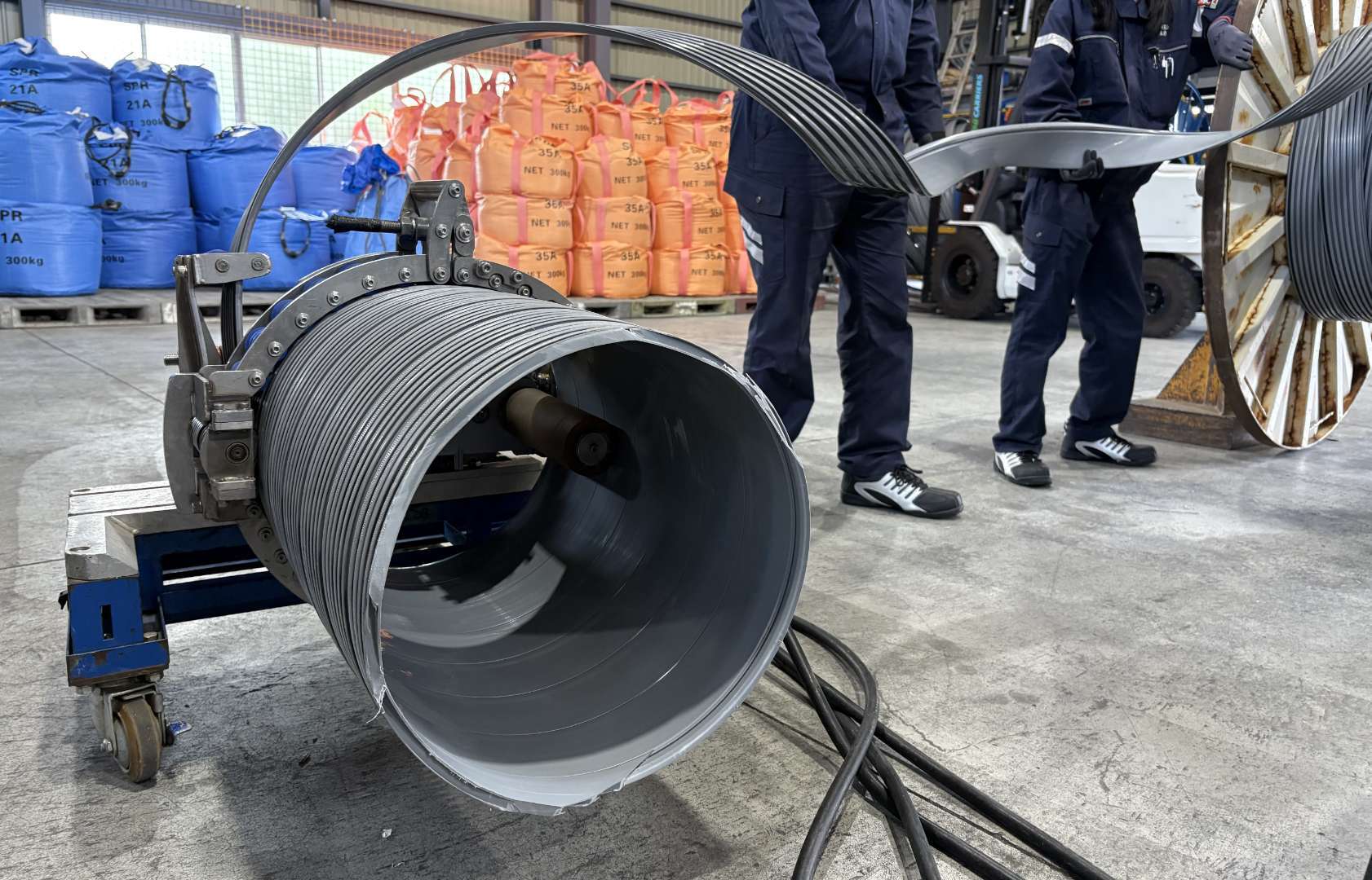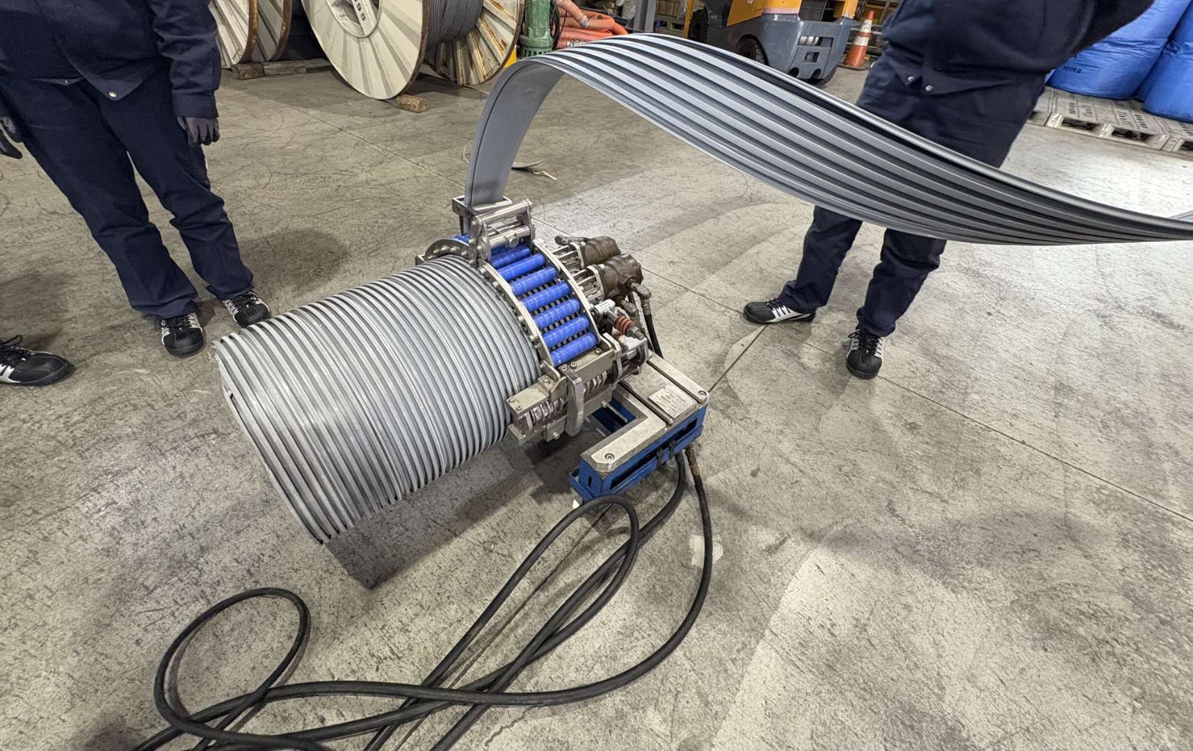 作りたい下水道管径に合わせた機械に差し込み、凹凸を嚙み合わせながら、ボタン操作で巻いたり、戻したりして、新しい下水道管を作っていきます。