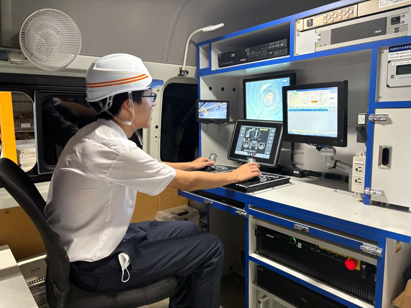 実際の操作は、モニター等を積んだ車の中で遠隔操作します!