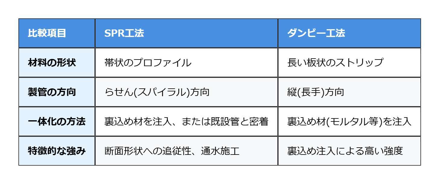 ダンビー工法とSPR工法は、どちらも老朽化した下水道管を蘇らせる優れた技術ですが、その原理や得意な状況は異なります。