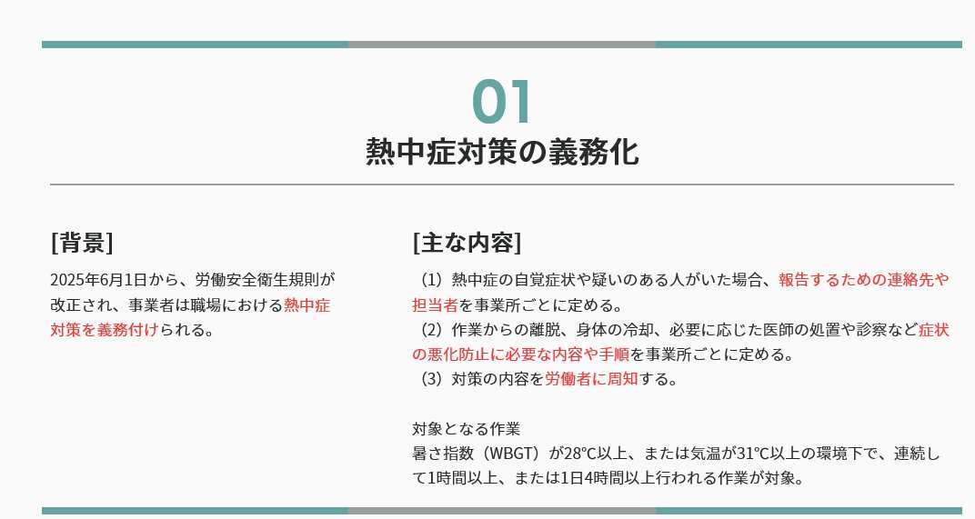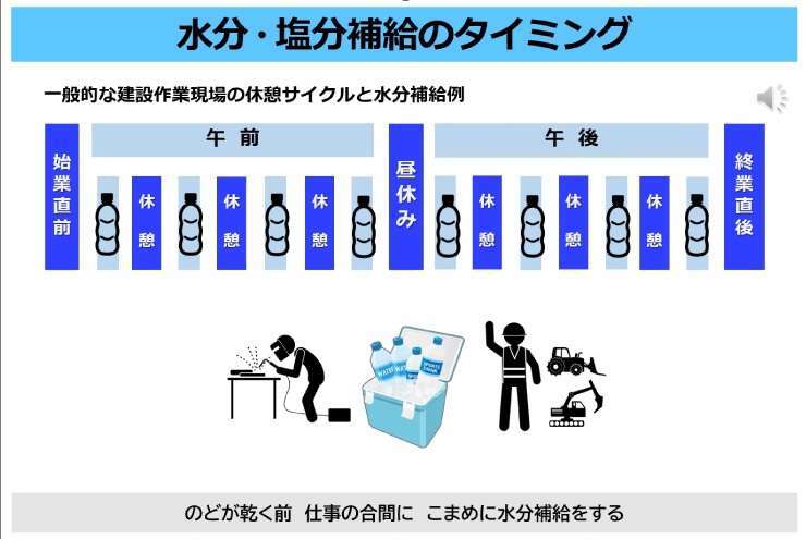 日々の現場を安全に行うため、熱中症に関する法改正についてや、予防方法などを周知し認識を統一する機会を作りました。